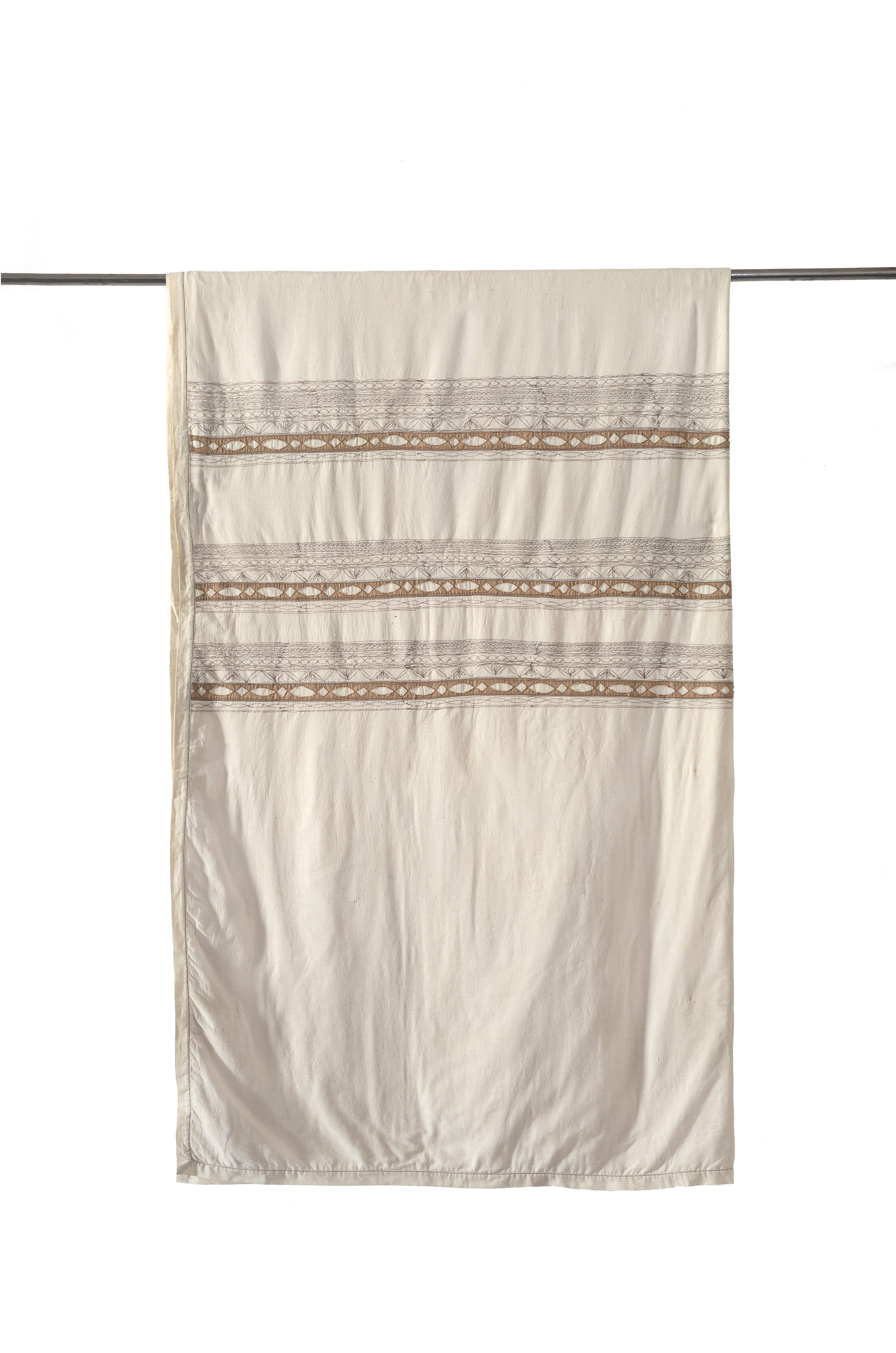 Delicate embroidery stitches running in a subtle combination of brown and natural on khadi, with bands of cutwork in sand, the Kiyomi blanket features an amalgamation of tradition and contemporary. With tucking done all over the blanket in natural, each piece may vary slightly due to human touch of design.