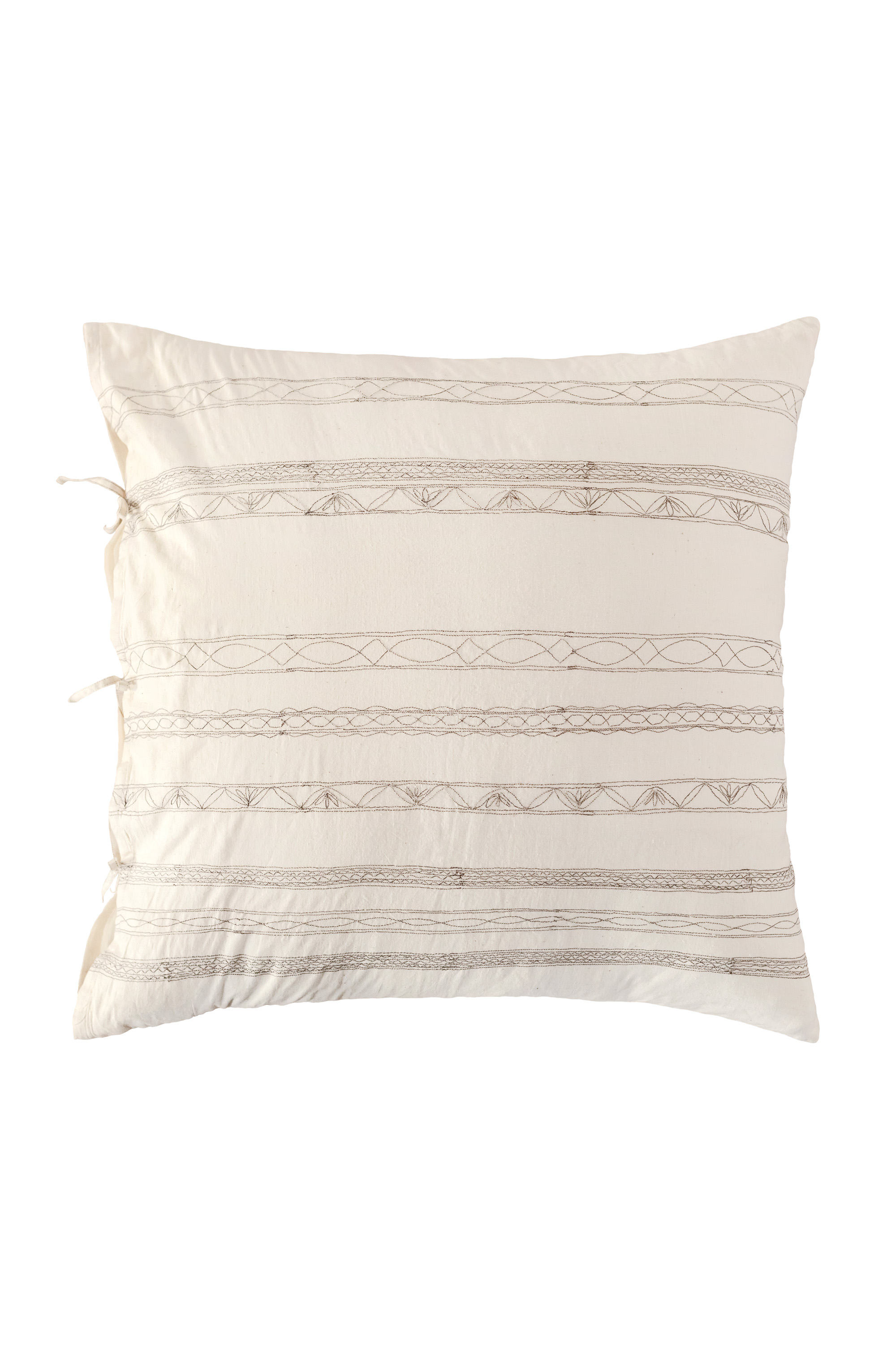 Delicate embroidery stitches running in a subtle combination of brown and white on khadi, the Haru cushion features an amalgamation of tradition and contemporary. The cushion is enclosed with ties.