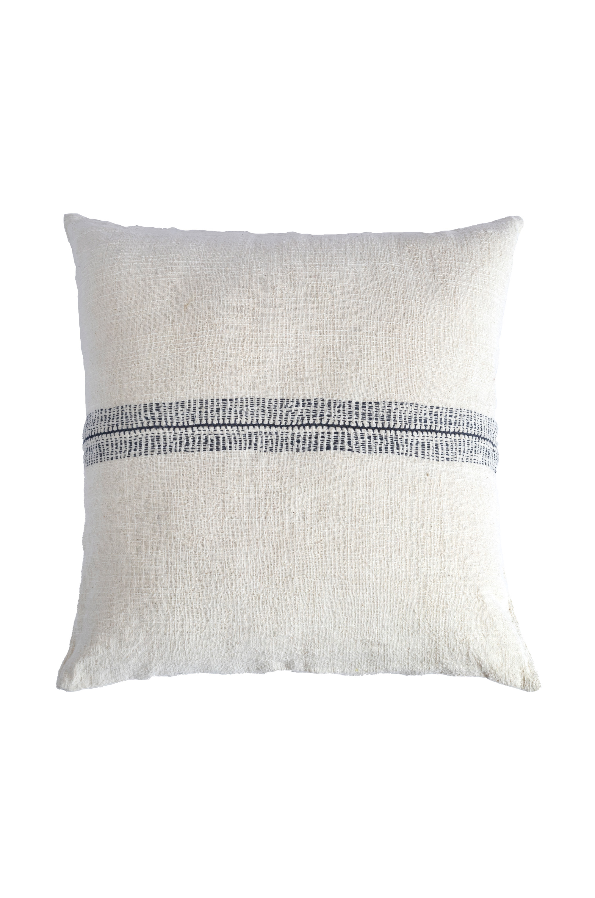 A delicate kantha embroidered line running across the length, and striking charcoal threads against a natural backdrop makes for the Marina cushion. The cushion is handwashed to further achieve soft and relaxed textural appeal. Enclosed with a brass zipper, each piece varies slightly due to the very nature of hand crafted design.