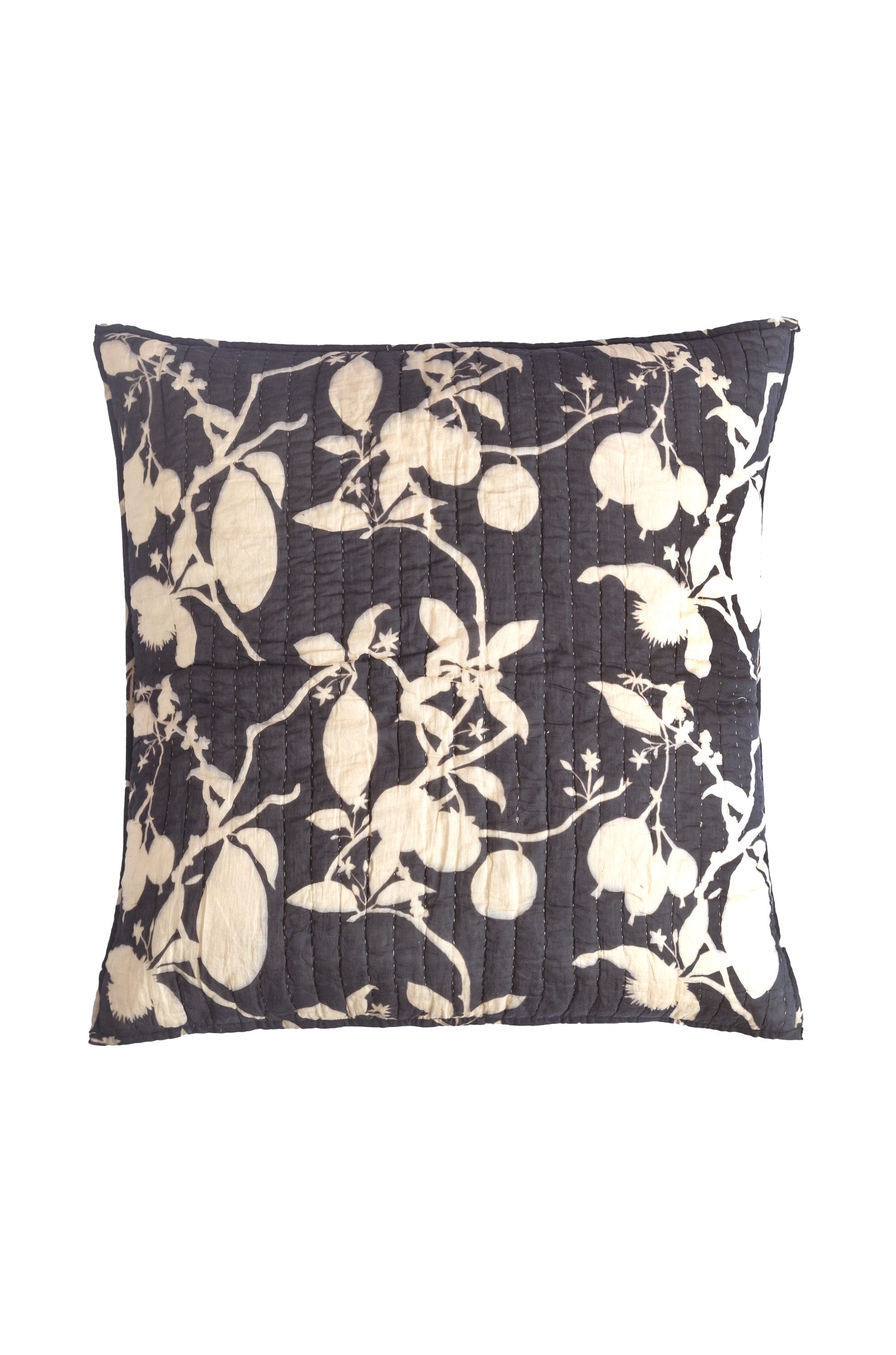 Crafted with fine cotton is the Pear sham. With hand quilting all throughout using a distinct pop of colour and printing in contrasting colours, it is heavily washed for textural richness. This sham is mid weighted and easy care making them perfect for year round use. Each piece is filled with 100% cotton. This beautiful piece consists of a fruit print in the front and printed stripes in the back